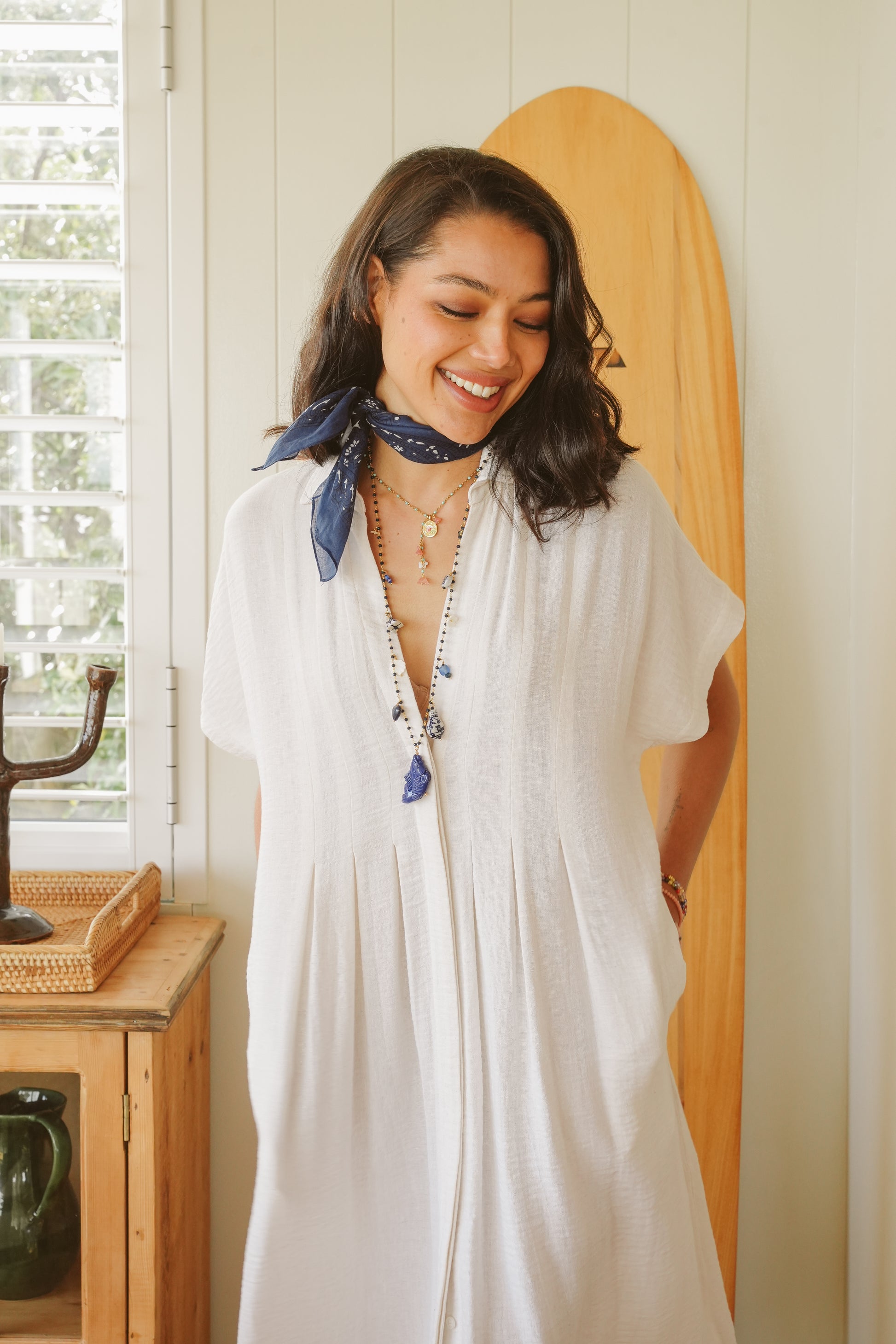 The Daisy Linen Pleat Dress brings ease and femininity to an everyday classic. Designed with flutter sleeves and a flowing shirt-dress silhouette, it offers a balance of structure and softness. A concealed button stand keeps the look clean, while delicate pin tucks and a subtle box pleat at the bust add thoughtful detail. Finished with a curved hem and side slits for movement, this dress is a timeless piece that feels polished yet relaxed — perfect for any occasion.
