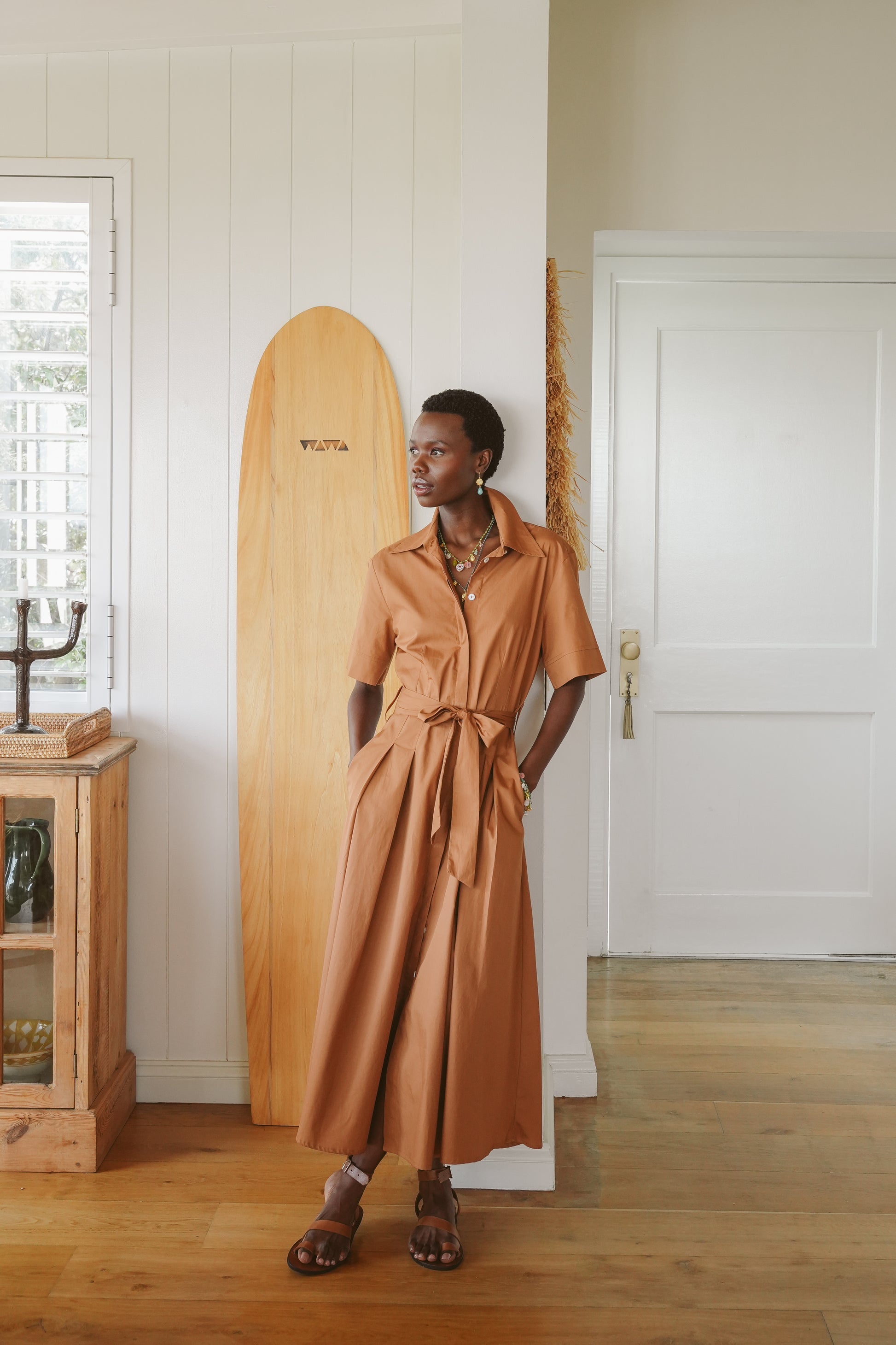 The Piper Poplin Shirt Dress offers a refined take on everyday dressing. With its midaxi length and softly pleated skirt, it brings a natural flow to your look. The concealed button stand keeps the full button-down front neat, while the cuffed elbow-length sleeves add a gentle structure. Wear it with the detachable belt for a defined silhouette, or leave it loose with sandals for an easy coastal feel.